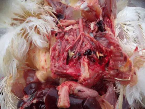 ⊙死亡鸡只多为中上等个体并且99%的肚皮朝上,经常可见病鸡仰头向天、闭着眼睛张口喘气仰卧(腹部朝上)死亡。